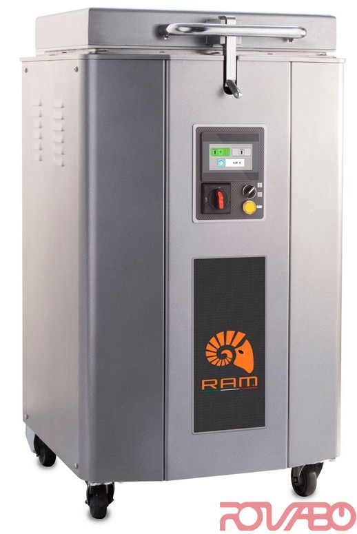 Machine suitable to divide dough for bakeries, pastry workshop and pizzerias. Steel stove painted structure. Basket in stainless steel AISI 304. Complete hydraulic working with big tank and double sealing between tank and hydraulic unit. AISI 304 stainless steel knives bolted not welded to guarantee a bigger precision and life. High quality food material stamps not subject to expansion. Stainless steel anti-corrosion protection above to the stamping plate. Display for pressing time adjustment. Automatic switching off at the end of the cycle for a bigger safety and energy saving. Stainless steel collecting crumbs tray easy to reach thanks to lateral covers assembled on hinges. Possibility to use it just as a press dough/butter (without dividing). Knives cleaning push-button. On castors made of soft rubber with brake for greater stability and noiselessness. Working cycle: automatic pressing, cutting and lid opening.
