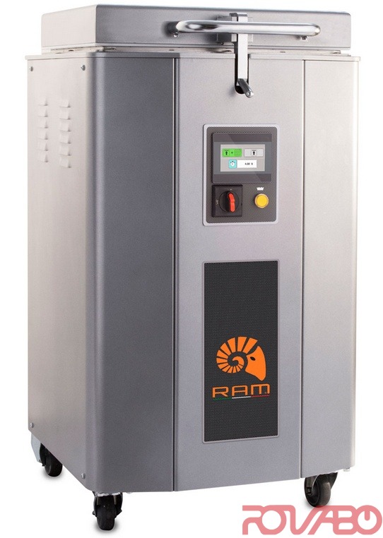 Machine suitable to divide dough for bakeries, pastry workshop and pizzerias. Steel stove painted structure. Basket in stainless steel AISI 304. Complete hydraulic working with big tank and double sealing between tank and hydraulic unit. AISI 304 stainless steel knives bolted not welded to guarantee a bigger precision and life. High quality food material stamps not subject to expansion. Stainless steel anti-corrosion protection above to the stamping plate. Display for pressing time adjustment. Automatic switching off at the end of the cycle for a bigger safety and energy saving. Stainless steel collecting crumbs tray easy to reach thanks to lateral covers assembled on hinges. Possibility to use it just as a press dough/butter (without dividing). Knives cleaning push-button. On castors made of soft rubber with brake for greater stability and noiselessness. Working cycle: automatic pressing, cutting and lid opening.