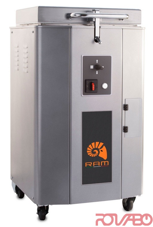 Machine suitable to divide dough for bakeries, pastry workshop and pizzerias. Steel stove painted structure. Basket in stainless steel AISI 304. Complete hydraulic working with big tank and double sealing between tank and hydraulic unit. AISI 304 stainless steel knives bolted not welded to guarantee a bigger precision and life. High quality food material stamps not subject to expansion. Stainless steel anti-corrosion protection above to the stamping plate. Stainless steel collecting crumbs tray easy to reach thanks to lateral covers assembled on hinges. Knives cleaning push-button. On castors made of soft rubber with brake for greater stability and noiselessness. Working cycle: independent pressing and cutting by joystick, manual lid opening.