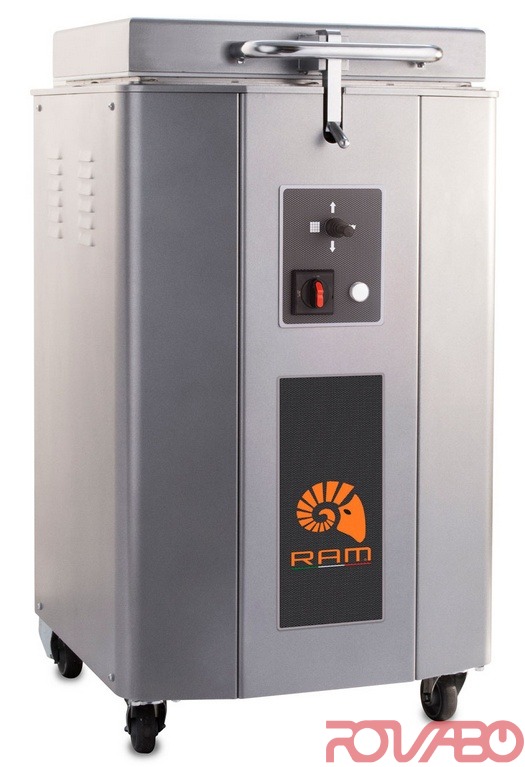 Machine suitable to divide dough for bakeries, pastry workshop and pizzerias. Steel stove painted structure. Basket in stainless steel AISI 304. Complete hydraulic working with big tank and double sealing between tank and hydraulic unit. AISI 304 stainless steel knives bolted not welded to guarantee a bigger precision and life. High quality food material stamps not subject to expansion. Stainless steel anti-corrosion protection above to the stamping plate. Stainless steel collecting crumbs tray easy to reach thanks to lateral covers assembled on hinges. Knives cleaning push-button. On castors made of soft rubber with brake for greater stability and noiselessness. Working cycle: independent pressing and cutting by joystick, manual lid opening.