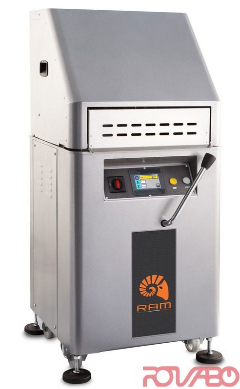 Machine suitable to divide and round dough for bakeries, pastry workshop and pizzerias. Steel stove painted structure, stainless steel AISI304 knives. Dividing disc in processed food aluminum casting. Safety guard placed in the plate insertion area. Knives cleaning push-button. Equipped with three PETG food material plates. The color touch screen gives the possibility to store 100 different programs and for each program it allows to adjust the pressing time and the height of the rounding chamber on the base of type and quantity of dough to work. On castors, with stopping feet and key for their adjustment. Working cycle: automatic pressing and cutting. Rounding by lever. PRESSING BY MEANS OF TWO CYLINDERS, CUTTING UNDER PRESSURE WITH INDEPENDENT CYLINDER.