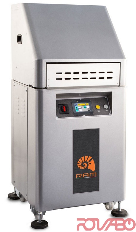 Machine suitable to divide and round dough for bakeries, pastry workshop and pizzerias. Steel stove painted structure, stainless steel AISI304 knives. Dividing disc in processed food aluminum casting. Safety guard placed in the plate insertion area. Knives cleaning push-button. Equipped with three PETG food material plates. The color touch screen gives the possibility to store 100 different programs and for each program it allows to adjust the pressing time and the height of the rounding chamber on the base of type and quantity of dough to work. On castors, with stopping feet and key for their adjustment. Working cycle: automatic pressing, cutting and rounding. PRESSING BY MEANS OF TWO CYLINDERS, CUTTING UNDER PRESSURE WITH INDEPENDENT CYLINDER.