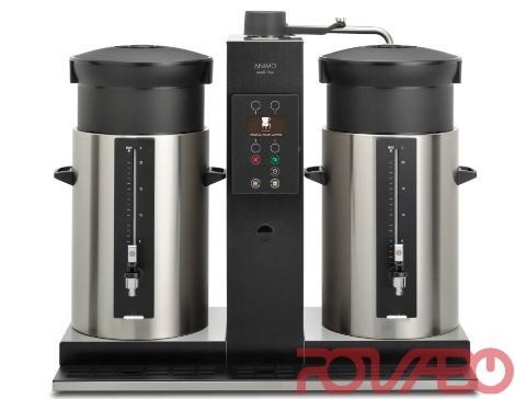 Coffee brewer ComBi-Line 2x5 with 2 removable containers for brewing large quantities of coffee in a short time. The machine is equipped with a capacitive touch user interface, fixed water connection, swivel arm protection, container detection, soft start, timer, coffee-ready signal, coffee dosing advice, total and day counters. The containers have been made out of stainless steel 18/9 and are supplied with synthetic filter (light in weight), drip tray with grid, coffee blender, scale and coffee fur remover with funnel, extra gauge glass, gauge glass brush and basket filter paper for the first brews. Hour capacity coffee: 30 l. Tap outflow height: 185 mm.
