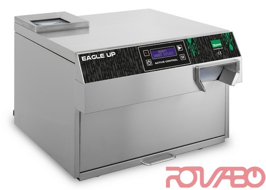 The Cutlery Dryer programme means dry, polish and sanitize the cutlery, representing an important innovation in the catering equipment market. The drying way is completely closed and made in stainless steel (but it’s openable). Completely insulated with sound-absorbing panels that save the energy and reduce the noise. NEW Automatic model equipped with electronic board which guides the user in operating the machine. Phases: WARMING – READY – REPLACE CORN COB. It can be placed on top of a table or onto a support. Suitable for middle-sized and big rooms. Easy to use: the wet cutlery pieces (10-12 at a time) are inserted into the upper part of dryer, and then come out automatically from the front of the machine. They slide inside an inspectionable spiral tank made of stainless steel, immersed in hot corn cob. The production amounts to about 5000/6000 cutlery pieces. Recommended for activities with a capacity of up to 250 seats. The corn cob is a plant-based and biodegradable material and can be used for about 120 working days. Technical features: stainless steel AISI 304 structure, power circuit: 12V. Supplied with: 1 Box of corncob Kg. 4; Pair of runners for cutlery basket. Optional: Wheel-mounted support; Cutlery basket.