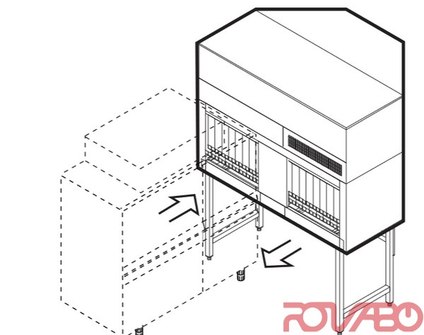Stainless steel body 18/10 AISI 304. Double skin with insulation. 180° corner exit. Use: by means of an electric or steam-activated battery (16 kg/h), a fan blows a jet of hot air 90°C on the dishes. Fan motor power: 1.1 kW. Fan capacity: 1300 mc/h. To avoid useless wastes, only a part of the necessary air is sucked in from outside, the remaining part is recycled from inside, where the temperature is higher. It is to be located at the machine output. Dimensions: total height of the machine mm 1960; increase in the Length mm 1085.