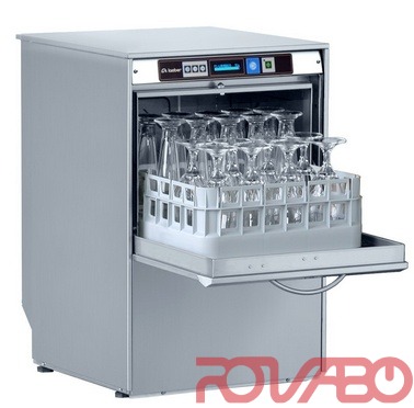 Stainless steel construction 18/10 AISI 304. Washing capacity: 900 pieces/H, 60/30/20 baskets/H. Wash cycle: 60/120/180 sec. Basket size: 40x40 cm. Work height: 315 mm. Clearance: 260 mm. Tank /boiler capacity: 8/ 3 l. Rinse-aid dispenser. Water connection: 12:20°C. Pump delivery: 160 l/min. Cycle/hour water consumption: 2/60 l. Water pressure/hardness: 2:4 bar/5:10°F. Rinsing water temperature: 80:90°C. Noise: <60 dB(A). Extractable soft-touch electronic control panel with interactive graphic display. Wash and rinse temperature electronic display. Complete programming of all the washing parameters. Cycle counter. Service maintenance function. Constante rinse boiler system (RCB). Drawn tank with self-cleaning bottom. Self washing tank. Insulated double skin. Integral tank filter. Stainless steel washing and rinsing arms. Rotating lower washing. Rotating upper and lower rinsing. Automatic tank loading. Door opening safety device. Economy thermostat. Thermocontrol (device which guarantees the selected temperature for every rinsing cycle even in case of non-stop work). Issue: 2 baskets for glasses, 1 insert for saucers, 1 cutlery container. Options: timed dispenser for liquid detergent, tank drain unit with filter, stainless steel base with lower open place h.575 mm, booster pump, round basket stainless steel support.