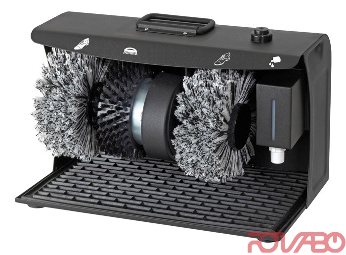 Shiny shoes without effort - foot-operated via button. Material: steel, powder coated. Electronic control unit, knob; carrying handle; ON/OFF switch; can be refilled. Equipped with 3 quiet rotation brushes, 1 cleaning brush for coarse dirt, 2 polishing brushes made of terylene (polyester) for light and dark shoes, shoe cream dispenser with ball valve for 100 ml fluid shoes cream (unfilled). Properties: dirt collection mat for easy cleaning; maintenance-free motor. Including 1 filling filter (for simple filling of the shoe cream dispenser).