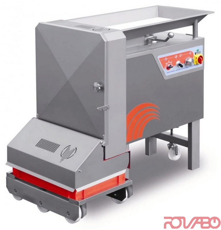 The Meat Specialist - whether red meat or poultry, fresh or frozen, the unique 4-sided pre-compression of this Dicer guaranteed highest cutting quality. Strongest Dicer of its class - motor power of 2,6 kW. Unmatched hydraulic performance - more than double oil-volume as equivalent Dicers. Unbelievable cutting length - 45 mm infinitely adjustable. High throughput Dicer - up to 560 cuts per minute. Extremely long grid blades - Dicer provide cleanest cut through meat and sinews to give separate cubes with perfect edges all-round. Hygiene door for clean work all around the Dicer - the cutting products cannot fall to the ground. Mobile on castors - Dicer is equipped with steering roller. Throughput max. 1100 kg/h; connected load 4,8-5,1 kW; chamber size 96x96x310 mm; grid set´s cross section 90x90 mm. Additional advantages: Processing temperature up to - 3°C for all cutting products beginning from 4 mm; Refined shape of the slice-cut knife ensures a powerful, smooth and clean cut; Ergonomic single-handed operation with lengthwise chamber opening; Extra durable cutting grids to cope with hardest workload as standard feature; Time saving double chamber system assures loading and dicing together; Piston advance at choice continuous for high volume cutting with double or four-bladed knife or intermittent cutting with single cut knife achieving precise cubes; Low break-in period also for untrained operator; Automatic positioning of the slice-cut knife after each cutting cycle; Minimum set up time to change grid sets, no tools required; Adjustable lengthwise pre-compression; Visual signal for loading readiness.