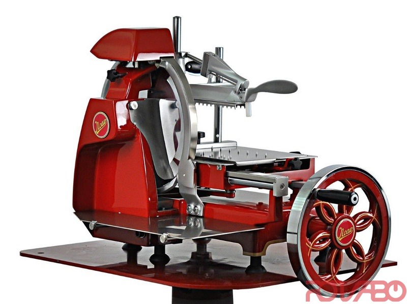 Blade ø300 mm, carriage movement 265 mm, thickness adjuster 0-1.5 mm, cut’s capacity ø215 mm. Built completely in aluminum and stainless steel, it is a compact slicer, but functional, elegant and extremely easy to clean. Made to cut all kind of cold cuts and particularly for "prosciutto". Point of strength of this machine is that can be easily cleaned, having large spaces between the blade and the head, thing that is not easy to find in other machines of the same category. The machine has a special blade in 100Cr6; this material is more resistant to the corrosion and rust. It is not only a beautiful complement of furnish, but also a functional machine, able of good cutting without discards and scraps. It is available in red colour as standard. On demand it can be supplied in several colours at choice.