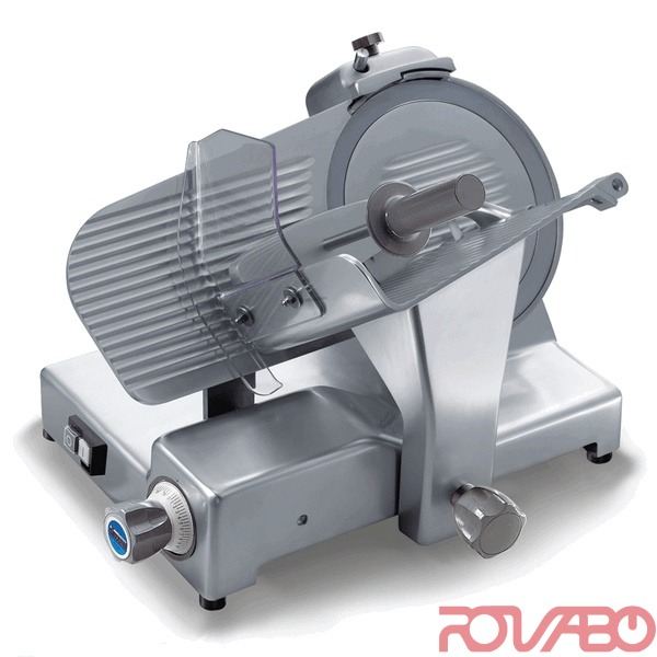 Rounded design and no sharp edges and visibile screws. Chrome plated and ground slide rod. Self lubricating slide rod bushings. Vulcanized rubber stops on carriage. Removable support cover for thickness gauge plate. Stainless steel slice deflector with bayonet fitting. Stainless steel screws and fittings. Enclosed and sealed belt pulley. 41 mm distance between blade and motor. Bottom cover. Built in sharpening tool with bottom protection. Standard blade removal tool. 38° blade inclination. Plastic knob. Rubber feet. Switch with IP44 protection rating. Blade diameter 300 mm. Cut thickness 19 mm. Run of carriage 275 mm. Hopper 250x275 mm.