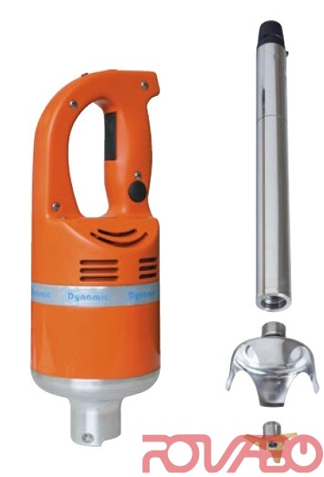 3 blades. Fully removable mixer foot and bell . For easy cleaning, maintenance and perfect hygiene. All stainless steel for increased durability of your mixer attachment. This Dynamic exclusive system complies with HACCP requirements. Will mix, blend, puree, emulsify, up to 25 gal. / 100 litres in just a few minutes. 3 000-10 500 rpm. ADVANTAGES. Safety switch. Continuous function auto run button allows to mix continuously or pulse. Ergonomic body. Higher Ventilation Point. Indicator light : for your safety the light indicates that the unit is plugged in and ready for operation. All stainless-stell tool and guard. Titanium-plated blade. Simply requires a small screwdriver to remove the blade. Mixer tool attachment can be easily disassembled. USE. Allows you to blend, puree, mix, & emulsify directly in the cooking pot. Indispensable for the soups preparations, salad dressings, gravy, sauces, mayonnaise, re-fried beans, batters and many other products. Ideal for pureeing many types of cooked vegetables or similar products. For the nurseries or for diets : puree of vegetables lightluy pulverized, porridge, raw carrots puree, fruits cream,etc... MAINTENANCE. Never clean this machine with water jet spray . Never immerse the motor block into any liquid . Put the tube with the blade protector in clear water and start the machine for 3 seconds or more to clean the inside of the blade protector. Disconnect immediately the plug of the mixer. Afterward, clean the outside of the tube and the blade protector by passing it under the faucet. Do not put tools in a dishwasher since high temperature and chemicals can dammage mechanical parts and plastic housing.