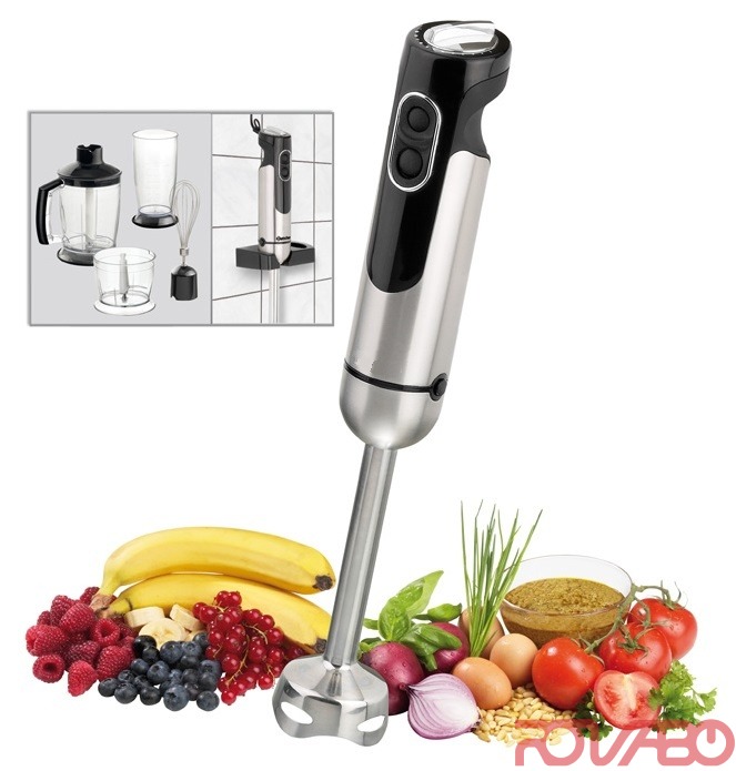 Ergonomic stainless steel design. Practical and easy to change attachments for the various functions. ON/OFF switch. 5 speed levels, mixer revs.: max. 17000 r.p.m. Length mixing bar: 207 mm. Total length: 410 mm. Simple and quick cleaning of the accessories. Accessories set, consisting of: 1 whisk, 1 container (800 ml), 2 special containers with sickle knife (500 ml + 1250 ml), 1 lid, fitting both special containers, 2 anti-slip coasters, 1 wall holder.