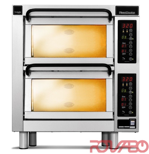 Hearth of natural material with crisping function. Digital display with electronic controls. Turbo-start function. Dual halogen lighting. Timer with manual shut-off alarm. Auto timer with alarm. See-through oven door with special heat-reflecting glass. Extra hearth-stone including control and heating element. 2 chambers 410х410 mm each. No extra shelf, 2 stones in total.