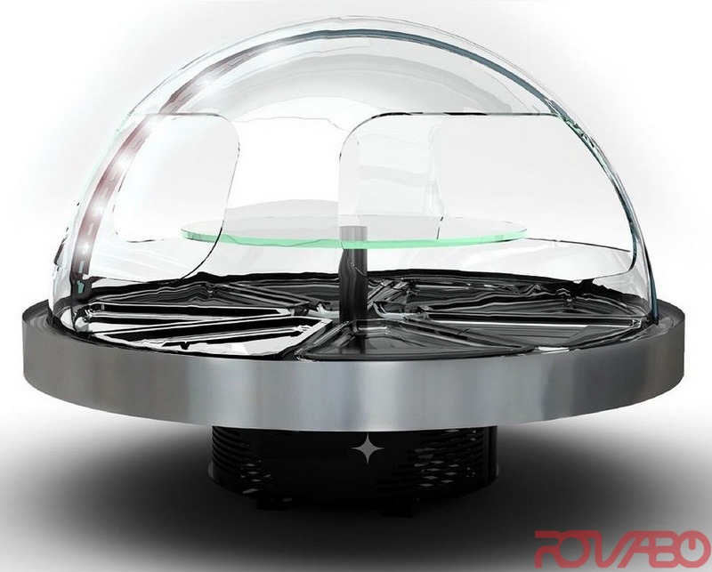Modelis unikalios formos, ji galima naudoti iš visų pusių. LED apšvietimas. Vitrinos diametras - 950 mm, aukštis - 750 mm. Galima montuoti į stalviršį arba statyti ant jo. Po vitrina galima dėti lėkštes arba stalo įrankius. Su 1 lentyna iš nerūdijančio plieno.
