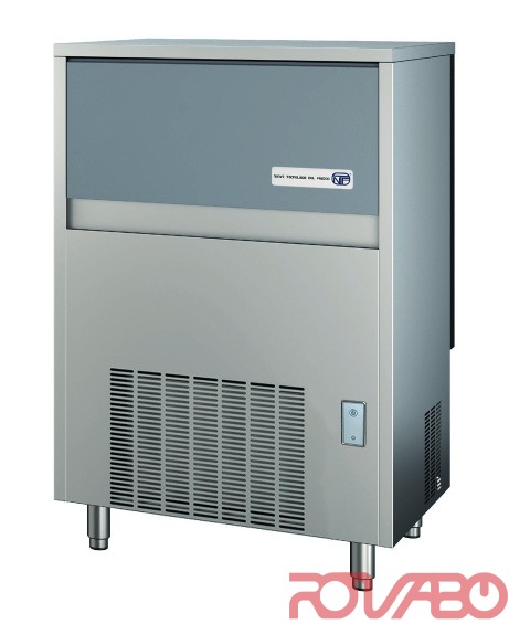 Type of produced ice: Frozen dice. Truncated cone format, slightly indented facets 17 gram (ambient temp. +21°C - water temp. +15°C). Crystalline and compact. Cools, but the flavour stays the same. Suitable for any shape of glass, a cool boost for drinks in hotels, restaurants, bars and discos. 110-150 mm adjustable foot. Water cooling system. Production 93 kg/24 h. Refrigerant: R290.