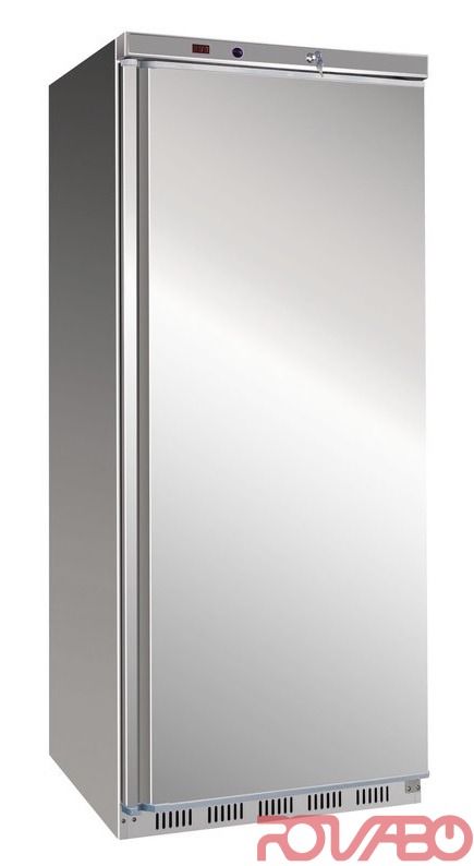 Commercial deep-freeze storage cabinet, 3-sided stainless steel, with forced-air condenser in the machine room. The seamless plastic inner container is easy to clean. Outer material: white powder-coated sheet steel. Inner material: ABS plastic white. The door with full-length handle strip is lockable and fitted with a magnetic plug-in seal, making it easy to service and replace without tools. Door hinge right, interchangeable. The manual thermostat and the digital temperature display are integrated in the front panel. 2 height-adjustable feet at the front, 2 castors at the back for easy transportation. Silent cooling. Manual defrosting. Wall thickness insulation: 60 mm. Refrigerant: R 600a (isobutane)/GWP 3, 130 g. Climate class 4 (+30 °C UT and 55% RH). Energy consumption per year: 989 kWh. The enclosed wall spacers must be fitted to ensure trouble-free operation. Series accessories: 7 evaporator grids, door with lock.