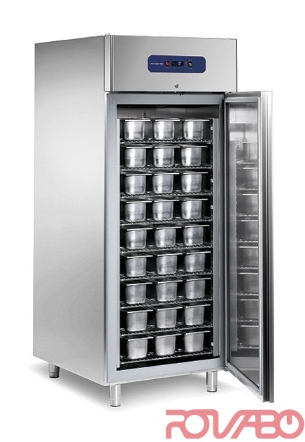 Room Temp.: +43°C /65% humidity. Ref. Gas.: R290 (170 g). Ideal for ice cream shops and suitable for 54 containers. Inside and outside made of Stainless Steel, Internal rounded corners. Insulation thickness: 60 mm. Self-closing doors with magnetic gaskets. Door micro switch. Electronic front control panel. Evaporator heater. Ventilated cooling. Completely automatic defrosting and condensate water evaporation. Adjustable Stainless Steel feet. Standard delivery: 10 Rilsan shelves 690x608 mm, door lock. Accessories: castors kit with brakes (2+3); plastic coated grid, 610x690x20 mm; pair of guides.
