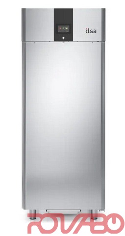 Ventilated aging cabinet, 1 compartment. Monocoque stainless steel AISI 304 housing; scotch-brite satin exterior finish; ecological 75 mm insulation thickness with high-density (ca. 40 kg/m3) HFC-free polyurethane foam; indirect and uniform internal air circulation; uniformly controlled automatic humidification and dehumidification system; electronic control via 5'' (14x9,5 cm) LCD display with advanced functions; 20 programmes; 6 cycles; pans pitch: 67 mm; adjustable stainless steel AlSl 304 18/10 feet h120-150; self-closing door with 90° stop, reversible; magnetic door gasket, tool-free replacement; moulded inner bottom with washing drain hole; rounded interior for better hygiene; automatic electric defrost with ultrasonic humidifier; automatic evaporation of condensation water (hot gas); CFC and HCFC free. Standard equipment: air pump, lock, interior light; liquid collection tray; rubber hoses for water inlet/outlet. Cooling gas R134A (370 g). Rear air circulation system. Monoblock refrigeration unit in climate class 5. Cataphoresis-treated evaporator with non-toxic epoxy resin. Noise level: 53 dbA.