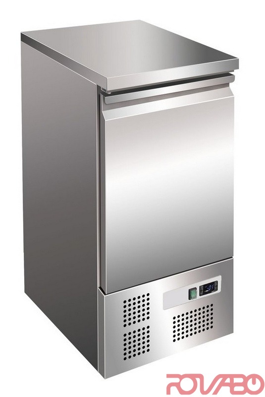 Made of chrome-nickel steel. Electronic control. Digital temperature display. Visual alarm display. Bottom constructed as basin with defrost water drain at the centre. Working plate folded on all sides, not removable. Hidden evaporator. Automatic defrost. 1 grid GN 1/1 is included.