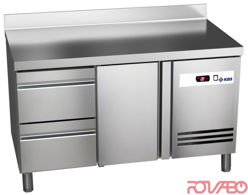Made of stainless steel. Back side made of galvanized sheet steel, inner side made of CNS 18/10. 2 half drawers (for GN 1/1). The worktop has 100 mm splashback, 700 mm deep. Top plate all-side 50 mm folded. Electronic control with temperature and cooling indication, as well as for automatic defrost (with condensate evaporation through hot gas). Separate on/off switch. Basin-shaped bottom (with drainage). 90° fixed self-closing doors. Magnetic door (1 door) seal and drawers, exchangeable without tools. Coated evaporator for extended service life. Pls. consider the evaporator raised in the upper part of the adjacent cooling compartment near the compressor compartment. So when using the drawers, the upper part can not be engaged, as well as with the doors operated and the upper rack not. 50 mm wall insulation. Air-cooling circulation. R 600a (Isobutan) refrigerant (64 g)/ GWP 3. Energy consumption per year: 956 kWh. Energy Efficiency Class C, A +++ up to G, EEI 45. Climate class 4 (+30°C ambient temperature and 55% RH). Height adjustable (125-200 mm) CNS feet. Accessories: 1 rack per door 325x535 mm.