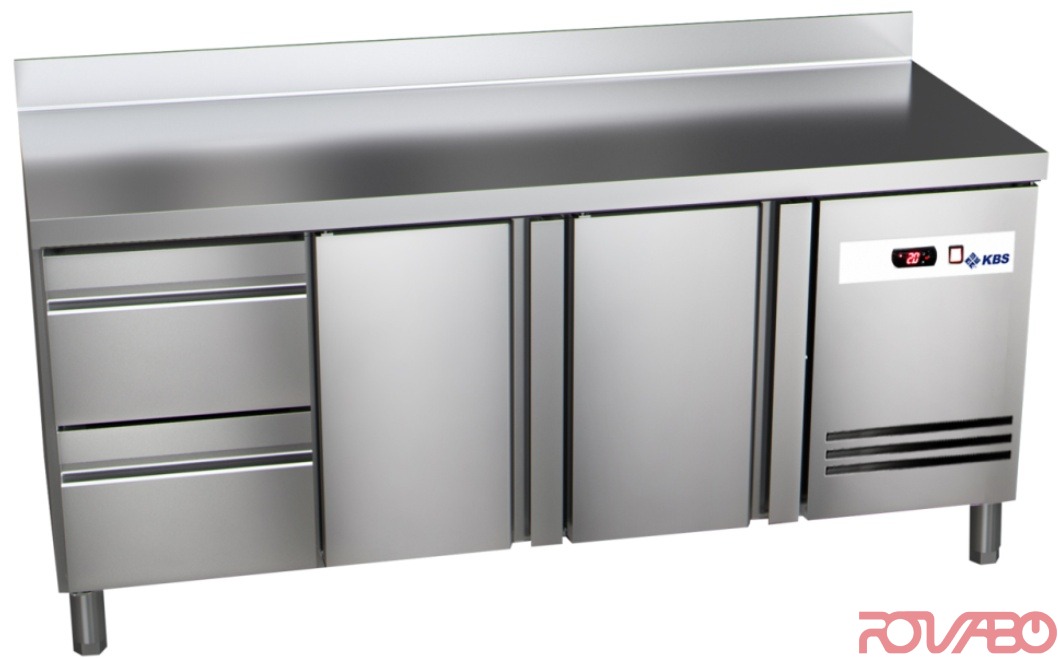Made of stainless steel. Back side made of galvanized sheet steel, inner side made of CNS 18/10. 2 half drawers (for GN 1/1). The worktop has 100 mm splashback, 700 mm deep. Top plate all-side 50 mm folded. Electronic control with temperature and cooling indication, as well as for automatic defrost (with condensate evaporation through hot gas). Separate on/off switch. Basin-shaped bottom (with drainage). 90° fixed self-closing doors. Magnetic door (2 doors) seal and drawers, exchangeable without tools. Coated evaporator for extended service life. Pls. consider the evaporator raised in the upper part of the adjacent cooling compartment near the compressor compartment. So when using the drawers, the upper part can not be engaged, as well as with the doors operated and the upper rack not. 50 mm wall insulation. Air-cooling circulation. R 600a (Isobutan) refrigerant (64 g)/ GWP 3. Energy consumption per year: 1,095 kWh. Energy Efficiency Class C, A +++ up to G, EEI 48. Climate class 4 (+30°C ambient temperature and 55% RH). Height adjustable (125-200 mm) CNS feet. Accessories: 1 rack per door 325x535 mm.