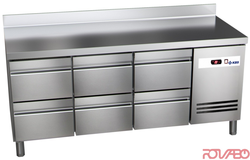 Made of stainless steel. Back side made of galvanized sheet steel, inner side made of CNS 18/10. 6 half drawers (for GN 1/1). The worktop has 100 mm splashback, 700 mm deep. Top plate all-side 50 mm folded. Electronic control with temperature and cooling indication, as well as for automatic defrost (with condensate evaporation through hot gas). Separate on/off switch. Basin-shaped bottom (with drainage). 90° fixed self-closing doors. Magnetic door (2 doors) seal and drawers (6, pls. see accessories), exchangeable without tools. Coated evaporator for extended service life. Pls. consider the evaporator raised in the upper part of the adjacent cooling compartment near the compressor compartment. So when using the drawers, the upper part can not be engaged, as well as with the doors operated and the upper rack not. 50 mm wall insulation. Air-cooling circulation. R 600a (Isobutan) refrigerant (64 g)/ GWP 3. Energy consumption per year: 1,095 kWh. Energy Efficiency Class C, A +++ up to G, EEI 50. Climate class 4 (+30°C ambient temperature and 55% RH). Height adjustable (125-200 mm) CNS feet.