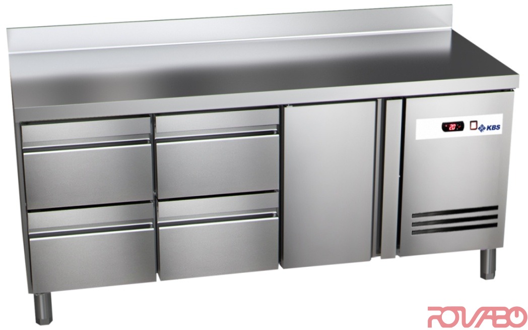 Made of stainless steel. Back side made of galvanized sheet steel, inner side made of CNS 18/10. 4 half drawers (for GN 1/1). The worktop has 100 mm splashback, 700 mm deep. Top plate all-side 50 mm folded. Electronic control with temperature and cooling indication, as well as for automatic defrost (with condensate evaporation through hot gas). Separate on/off switch. Basin-shaped bottom (with drainage). 90° fixed self-closing doors. Magnetic door (1 door) seal and drawers, exchangeable without tools. Coated evaporator for extended service life. Pls. consider the evaporator raised in the upper part of the adjacent cooling compartment near the compressor compartment. So when using the drawers, the upper part can not be engaged, as well as with the doors operated and the upper rack not. 50 mm wall insulation. Air-cooling circulation. R 600a (Isobutan) refrigerant (64 g)/ GWP 3. Energy consumption per year: 1,095 kWh. Energy Efficiency Class C, A +++ up to G, EEI 48. Climate class 4 (+30°C ambient temperature and 55% RH). Height adjustable (125-200 mm) CNS feet. Accessories: 1 rack per door 325x535 mm. Available from 01.03.25
