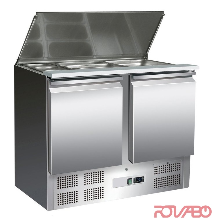CNS saladette with 3-sided foamed evaporator, temperature adjustable via electronic thermostat. Digital temperature display and illuminated on/off switch. The grease filter is located behind the lockable machine panel, is easily removable and washable. Grid size GN 1/1. 5 grids incl. 5 pairs of non-tilt support rails (accessories) can be fitted per door compartment. For optimum air flow in the cooling table, there is an additional shelf in the floor area behind each door. Door seals can be replaced easily without tools. Cutting board made of polyethylene, base designed as a tray and tapered, condensation drain in the middle. Door stop: Left/Right. Fitting: GN1/1. Mounting option: 3xGN 1/1. Container depth: 150 mm. Series accessories: 5 dividers, 1 rack GN 1/1 rilsanised white per door and 2 pairs of non-tilt support rails and polyethylene cutting board. Recirculated air cooling. Condensation evaporation. Automatic defrosting. Wall thickness insulation: 35 mm. Refrigerant: R 600a (isobutane)/GWP 3. Supplied without GN containers.