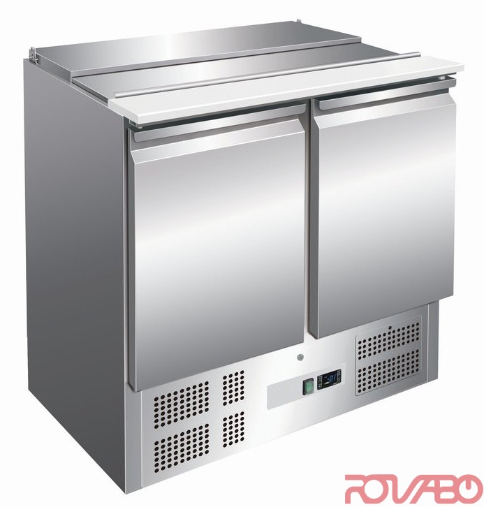 CNS saladette with 3-sided foamed evaporator, temperature adjustable via electronic thermostat. Digital temperature display and illuminated on/off switch. The grease filter is located behind the lockable machine panel, is easily removable and washable. Grid size GN 1/1. A maximum of 5 grids incl. 5 pairs of non-tilt support rails (accessories) can be fitted per door compartment. For optimum air flow in the cooling table, there is an additional grille in the floor area behind each door. Door seals can be replaced easily without tools. Cutting board made of polyethylene, base designed as a tray and tapered, condensation drain in the middle. Door stop: Left/Right. Fitting: GN. Mounting option: 2x GN 1/4 and 4x GN 1/3 and 4x GN 1/6. Container depth: 150 mm. Series accessories: 5 dividers, 1 rack GN 1/1 rilsanised white per door and 2 pairs of non-tilt support rails and polyethylene cutting board. Recirculated air cooling. Condensation evaporation. Automatic defrosting. Wall thickness insulation: 45 mm; therefore lower energy consumption. Refrigerant: R 600a (isobutane)/GWP 3, 70 g. Supplied without GN containers.