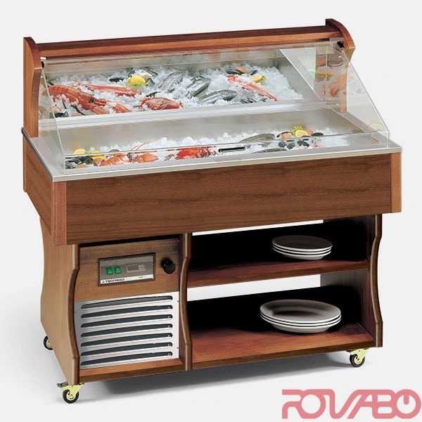 Refrigerated plate dimensions 1307x587x160 mm. Salt-proof AISI 316 stainless steel basin. Evaporator set in the polyurethan of the tank. Refrigerant R404A. Static refrigeration, automatic defrost. Water outlet Ø 20 mm. LED di serie. Optional colors RAL and treated raw wood.