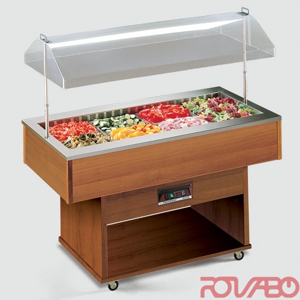 AISI 304 stainless steel internal basin with longitudinal satin fiishing laser cut. Thermoformed polymethylmethacrylate, high transparency hood and manual lifting - stainless steel handles for MANUAL lifting of the dome. Wide service-shelf in the bottom. Numerous interior customization possible, to meet your needs. Telescopic hood’s support-arms made of low roughness stainless steel with polyoxymethylene. Hostaform sliding supports. Control panel with display, built-in microprocessor control. Digital display of temperature. Polyamide-coated 4 swivel castors as standard with brake function. Modern structure in multilayered poplar wood. Automatic defrost. Automatic evaporation of defrost water. Static refrigeration. R290 cooling gas. Options: RAL colours. Accessories: tipping plate-holder shelves.