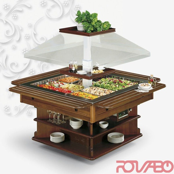 Stainless steel AISI 304 tank with painted dark or light walnut external wooden structure (or untreated raw wood). Stainless steel AISI 304 ventilation grids. Arrangement for stainless steel GN basins from 1/9 to 2/1 and up to 150mm height. Thermoformed PMMA motorized hood, high transparency, with telescopic support arm in stainless steel. LED lighting with high color rendering and low power consumption. Control panel with transparent safety cover and electronic control unit. Digital display for internal temperature. Robust swivel wheels with and without brakes, as standard. Additional wooden shelves at the top and bottom of the tank for supplementary equipment. Static refrigeration, automatic defrost. R404A. LED di serie. OPTIONAL/ACCESSORIES: stainless steel tray for pastry or ready-to-serve dishes, RAL colours or treated raw wood, GN basins.