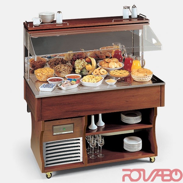 Wall gastronorm buffet display unit. Stainless steel AISI 304 tank with painted dark or light walnut external wooden structure (or untreated raw wood). Internal mirror side. Stainless steel AISI 304 ventilation grids. Thermoformed PMMA motorized hood, high transparency, with telescopic support arms in stainless steel. Thermal insulation with High Density Polyethylene foam. LED lighting with high color rendering and low power consumption. Control panel with transparent safety cover and electronic control unit. Digital display for internal temperature. Robust swivel wheels with and without brakes, as standard. Underlying wooden shelves. Room temperature. Neutral display surface in stainless steel dim. 1320x645 mm. Optional/accessories: Solid wood hinged jointed plates holder shelves; Smoky sliding glass doors for neutral case; Blind side closure kit; RAL colours or treated raw wood.