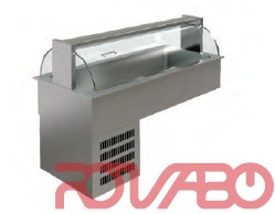 Stainless steel top AISI 304, th. 12/10. Welded and rounded tank for an easy cleaning. Tank for GN containers with maximum height of 200 mm. Contact cooling refrigeration through contact coils under the tank. Condensed water drain on bottom (evaporation kit on request). Insulation by high density expanded polyurethane without C.F.C. and H.C.F.C. With condensing unit or pre-set for remote refrigeration. Digital control system for temperature adjustment and defrosting. Display case with plexiglass doors. 1280x510x210 mm well. R452A refrigerant gas. Cooling power at -30°C - 0.32 kW. Inlet/ outlet gas pipe - ø6/ 10 mm.