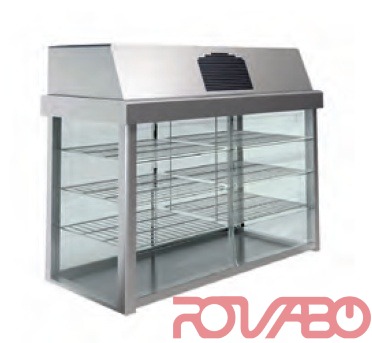 Stainless steel top AISI 304, th. 12/10. Display case with 3 stainless steel grid shelves. Refrigeration by means of ventilated fans. 4+4 polycarbonate flaps on customer side, 2 sliding doors on operator side. With condensing unit. Kit for condensed water evaporation. Digital control system for temperature adjustment and defrosting. Neon lighting element 0.036 kW. R452A refrigerant gas 1150 gr.