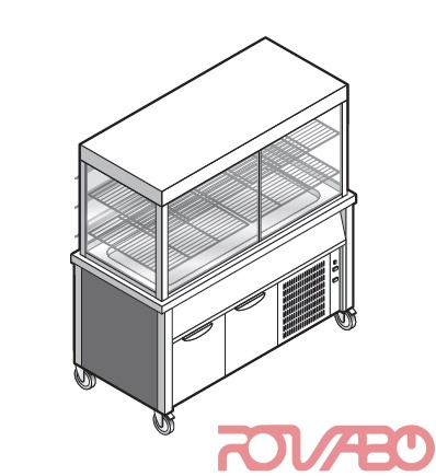 Top H = 50 mm made of stainless steel AISI 304, th. 12/10 with rounded edges. Welded and rounded tank 1280x510x210 mm for a better cleaning (GN containers H = 200 mm). Contact cooling refrigeration through contact coils under the top. Insulation by high density expanded polyurethane without C.F.C. and H.C.F.C. Display case 1482x642x700 mm with 2 grid shelves, refrigerated through ventilated evaporator fixed in the ceiling. Display case with 3+3 polycarbonate flap doors on customer side, 2 sliding doors on operator side. Refrigerated cabinet with 2 hinged doors complete with GN 1/1 guides. With condensing unit. Condensed water drain on bottom. Independently managed temperature and defrost of the top and the cabinet by digital programmable thermostats. Automatic defrosting. R290 refrigerant. Cooling power at -15°C: 0.86 kW. Depth w/tray slide: 1000 mm. Open/ refrigerated (+2/+10°C) cupboard 900x590x420 (223 lt.)/ 800x540x350 (151 lt.) mm. Display case lighting.