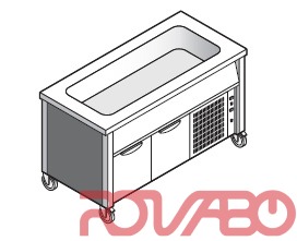 In stainless steel 18/10. Top H = 50 mm made of stainless steel AISI 304, th. 12/10 with rounded edges. Welded and rounded tank for a better cleaning. Tank suitable for GN containers max. H = 200 mm. Contact cooling refrigeration through contact coils under the tank. Insulation by high density expanded polyurethane without C.F.C. and H.C.F.C. Refrigerated cabinet with hinged doors complete with GN 1/1 guides. With condensing unit or pre-set for remote refrigeration. Condensed water drain on bottom. Independently managed temperature and defrost of the tank and the cabinet by digital programmable thermostats. 3 hinged doors. 1350x590x420 mm cupboard (334 l), 1930x510x210 mm well. Automatic defrosting. R452A refrigerant gas.