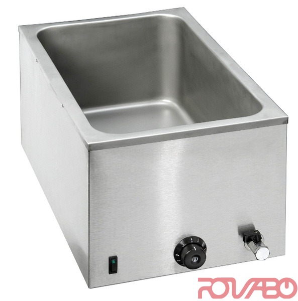 Table-top unit. Made of chrome nickel steel. 1x1/1 GN container, 200 mm deep. Electro operating mode. 1 tank 305x505x205. Pluggable. Water drain tap.