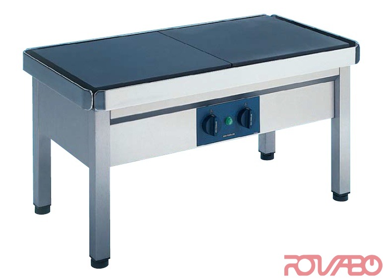 Stainless steel stand. Recessed control panel. Safety device to prevent overheating. Two hotplates: 400x400 mm. Cast iron hotplates. Seven-position control for optimal heat adjustment. Safety rails. Adjusting screws on all four legs. Working height: 450 mm.