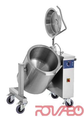 The cylinder of a kettle made of stainless steel. A rack-holder made of stainless steel. A basic rack-holder on right-hand side. Completely welded, isolated capacity of a kettle. A liter scale. A small quantity of water in the steam generator. Heating elements mounted in front of a kettle. Short pipelines in cold environment for tap water giving in a kettle. The built in divider. The lock nut prevents dangerous return overturning in case of malfunction. A manometer. Not heated up top part of a kettle. Design on 4 castors Ø160 mm. Hinged opened /closed easily cover with the ergonomic handle. The copper height is specified with open cover. Length – without rack-holder.