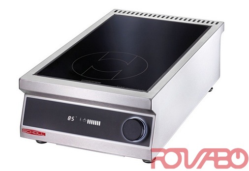 Design: Casing completely made of chrome nickel steel 18/10, with one cooking field. Ceran field 6 mm strong. Round coil, diameter 220 mm. Device with replaceable fat filter unit. Temperature control via rotary knob with integrated power switch.