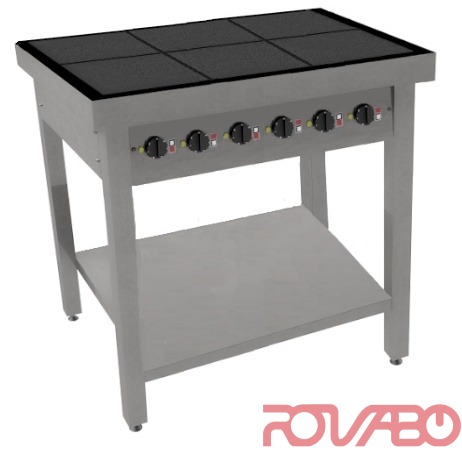 Материалы : корпус из нержавеющей стали «мокрой» шлифовки (скотч-брайт), ножки из трубы нержавеющей стали 50х50 мм. Главные особенности : 6 чугунных конфорок EGO 300х300 мм.