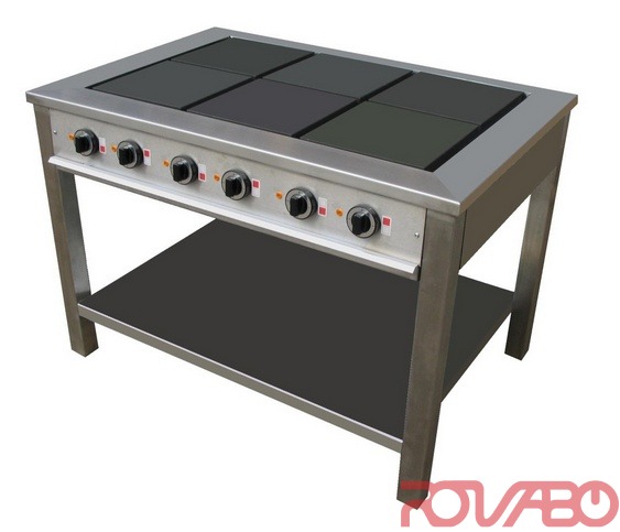 The body of industrial elecrical stove is made from stainless steel. Legs of stove are made from tube 50x50 mm of stainless steel. Removable fat tray under the hotplates. „EGO“ tilting hotplates for easy cleaning are produced from cast iron 300x300 mm, the power of each 3 kW, 380V, 50Hz. “EGO” 7 positions switches for cooking zones, for heavy-duty use. Solid steel feet of legs are height adjustable by 30 (+15/-15) mm. Standard length L= 1,200 mm, width W= 800 mm, height H= 850-880 mm.