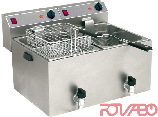 Completely in stainless steel. Oil bowl with rounded sharps, removable for an easy cleaning. Thermostat -switch scale 0°-190°, with indicator light. Cold area for decantation. Steel wire mesh basket with hook for drip-drying. Armoured heating elements. Lift-up head. In the case of the two-bowl models, independent single-bowl use option.
