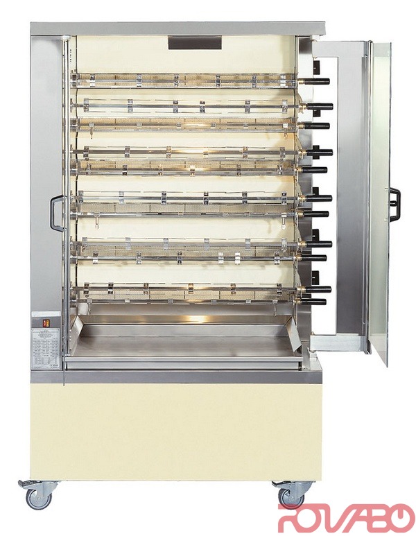 Made from stainless steel. Doors with tempered glass. Tray 870х295х50 mm, for juices, for roasting potatoes and vegetables. The plates between the burners removable for easy cleaning. Interior light. Wheel stand included. Diameter of wheels: 10 cm. 11 spits. Capacity 66 chickens. 30.444 Kcal/h.