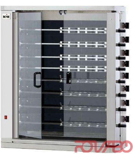 New range of electric vertical grills with vitroceramic burners for a better diffusion of heat and easy cleaning. Made from stainless steel. Doors with tempered glass. 15 spits. Capacity 90 chickens.