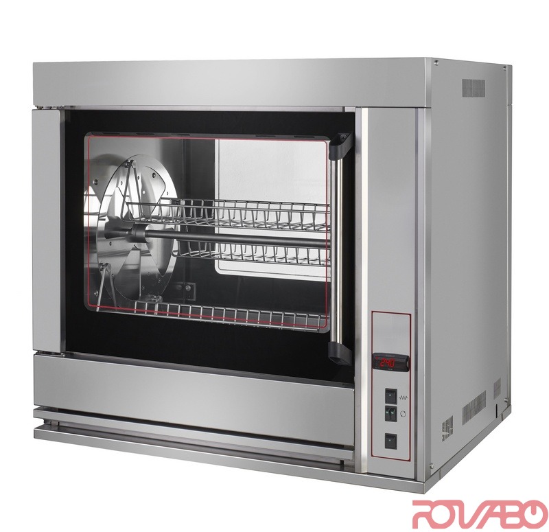 Smoke extractor is not required. Low power consumption. Uniform roasting by hot air currents. Can cook all types of food: beef, lamb, suckling pig, rabbits, pigs' trotters, potatoes, peppers, aubergines, tomatoes and, of course, chickens. It is not necessary to prick the products to cook. Made entirely of stainless steel. Interior light, highlighting roasts and attracting customers. Easy to clean. 4 spits. 16/20 chickens.