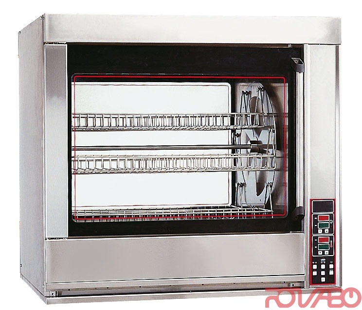 Smoke extractor is not required. Low power consumption. Uniform roasting by hot air currents. Can cook all types of food: beef, lamb, suckling pig, rabbits, pigs' trotters, potatoes, peppers, aubergines, tomatoes and, of course, chickens. It is not necessary to prick the products to cook. Made entirely of stainless steel. Interior light, highlighting roasts and attracting customers. Easy to clean. 7 spits. 35/42 chickens.