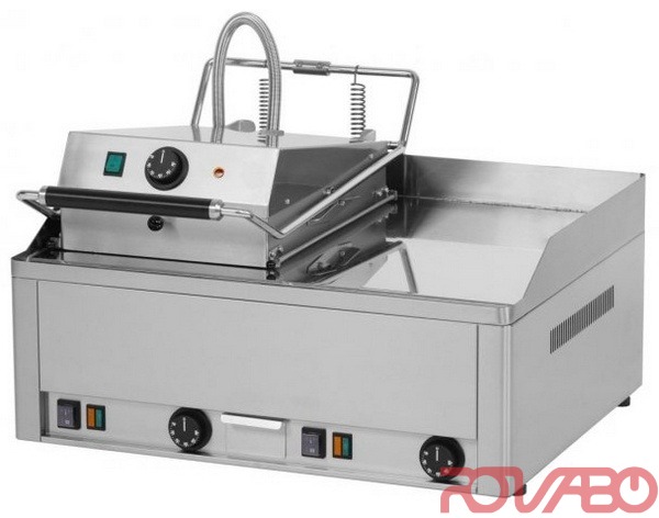 Griddle dimensions: 650x480+320x380 mm; surface finish: durable chrome; griddle thickness: 10.00 mm chromed, 0.03 mm Cr (non-stick dishes when roasting easier to clean the board); container for liquid fat; independent heating zones: separate control for each heating zone on the bottom plate and for the top plates; upper contact area with Teflon canvas (non-backed rollers; uniform warming the rolls). Protection of controls: IPX4. Material: AISI 430, only stainless steel used for food contact. Indicators: operation and warm-up. Cross-section of conductors CU: 4 mm².
