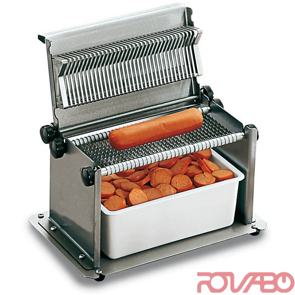 Manual stainless steel sausage cutter, easy to use and to clean. It cuts easily sausages, eggs, tomatoes: you just need to put the product on the blades, then to pull down the lid to its complete closure and the slices will fall down into the container below, ready to be used. Blades space: mm 12. Blade: nr. 17.